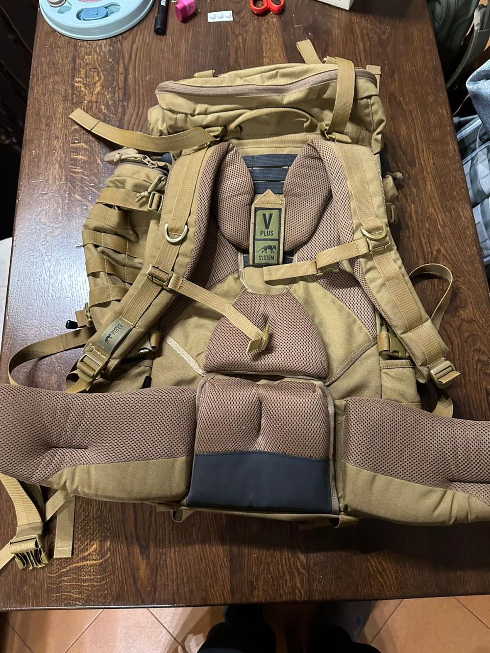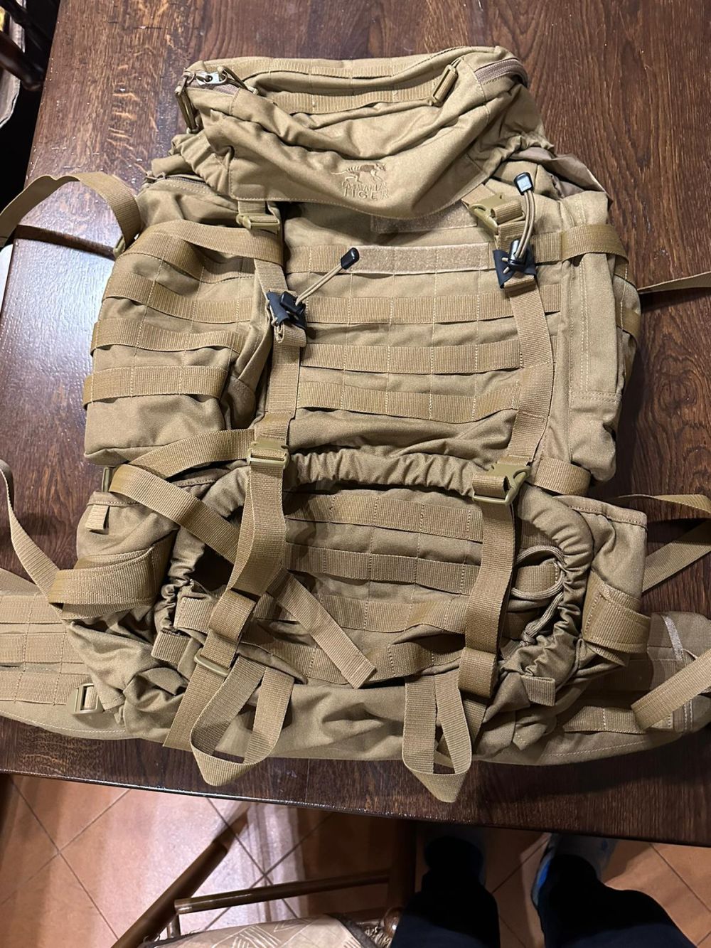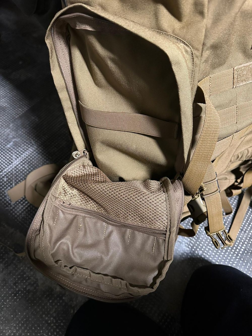 Zaino in colore coyote con schienale regolabile, capienza fino a 60lt espandibile a 100 con tasche su agganci molle. All’interno la camera è divisa in 2 ,parte sopra e parte sotto divise con una cerniera. Scarica molto bene il peso sulla lombare,le due tasche sul fianco sono organizer retina da una parte chiudibile con cerniera e fasce elastiche dall’altra.